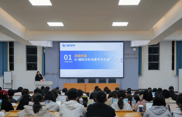 讲座中,朱琰老师聚焦AI在辅助学习、文献阅读与论文写作方面的应用,系统讲解了知网研学平台的三大功能板块。她紧扣选题规划、文献管理、智能研读及论文创作等科研全流程环节,为学员们破解论文开题、文献梳理及写作规范等难题提供了具体方法和实操路径。为助力学员掌握平台操作,朱琰老师现场演示了从登录认证、AI选题、智能研读,到笔记摘录与投稿的全流程,直观呈现了资料整合与读写辅助的一体化应用场景。