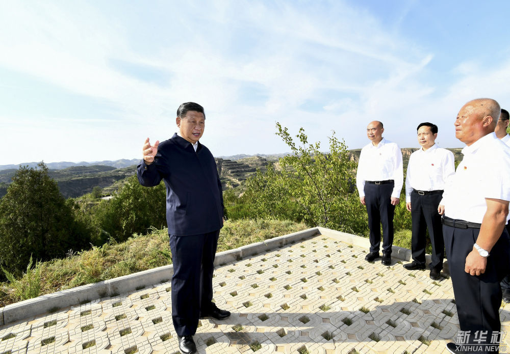 2021年9月13日下午,习近平在陕西省榆林市米脂县银州街道高西沟村龙头山山顶,考察黄土丘陵沟壑区综合治理情况。